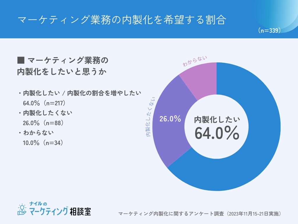 マーケティング業務を外注している339名に、内製化をしたいと思うか聞いたところ、約6割が「内製化したい(64%)」と回答しました。