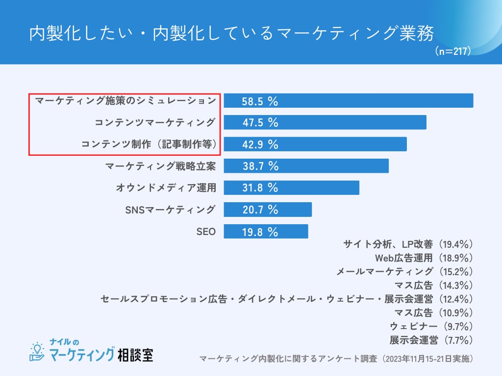 内製化したいマーケティング業務は、「マーケティング施策のシミュレーション(58.5%)」、「コンテンツマーケティング(47.5%)」「コンテンツ制作(42.9%)」が上位となり、現在外注しているマーケティング業務のランキングと同様であることがわかりました。