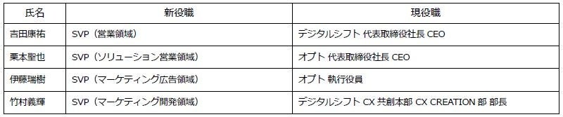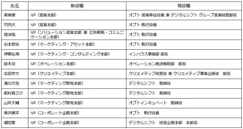 また、2023年11月7日ならびに、11月21日開催の取締役会において、同じく2024年4月1日付で、本組織再編に伴う株式会社オプトの執行体制について決議したことを、併せてお知らせいたします。