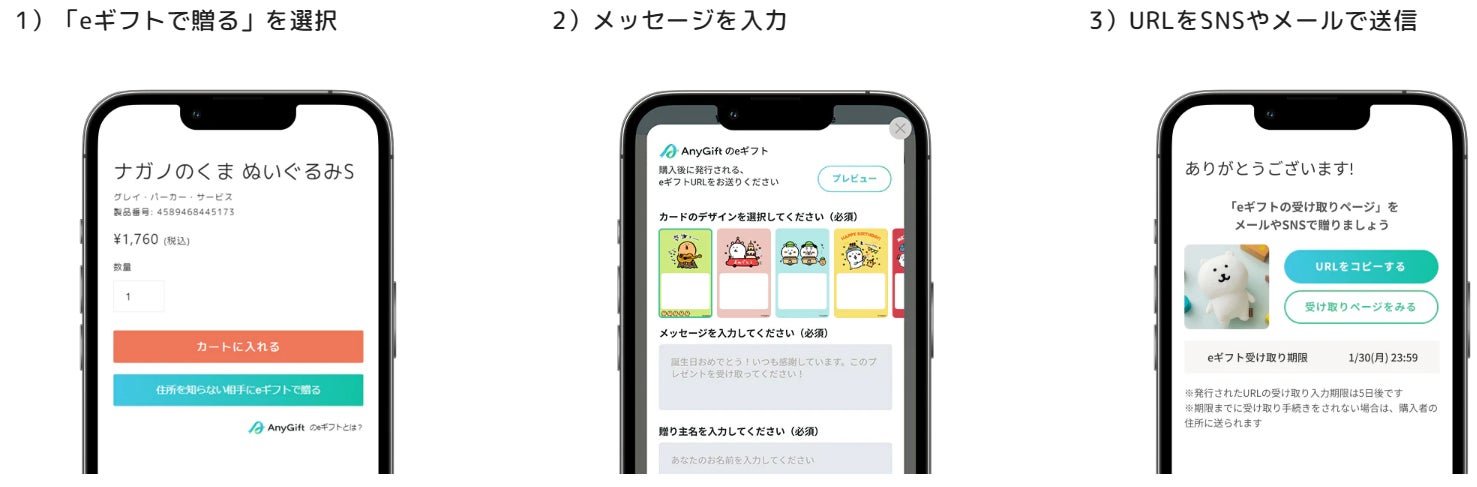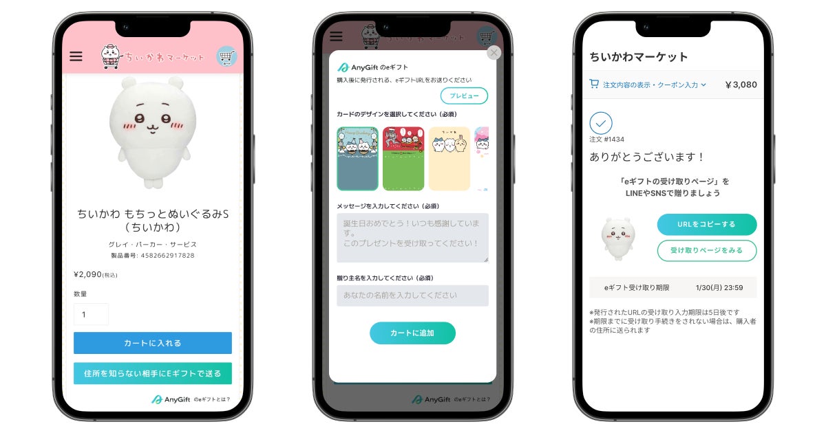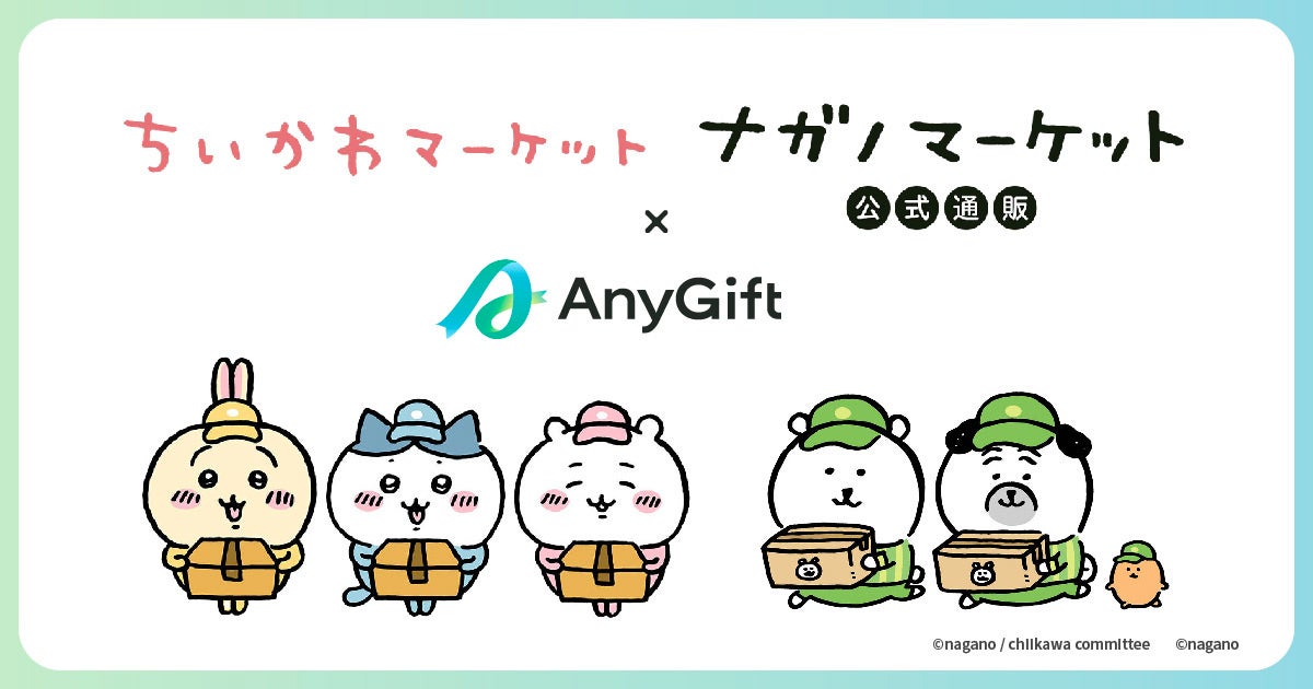 AnyReach株式会社(本社:東京都中央区、代表取締役:中島 功之祐)は、株式会社グレイ・パーカー・サービス (本社:東京都中央区、代表取締役:古屋 大貴)が運営する公式キャラクターグッズ通販サイトの「ちいかわマーケット」・「ナガノマーケット」にて、eギフトサービス『AnyGift(エニーギフト)』の提供を開始したことをお知らせします。