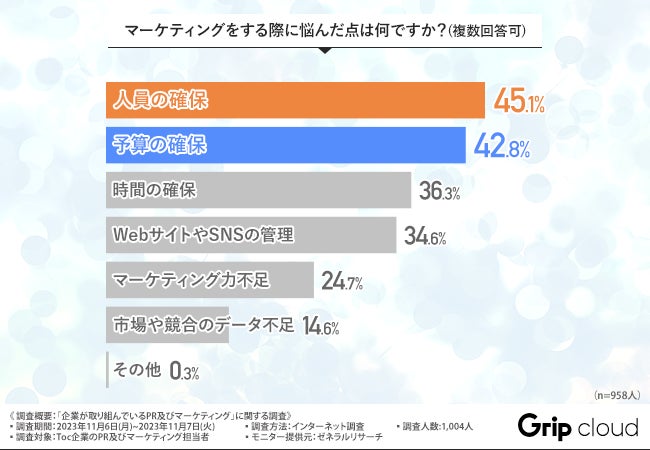 「マーケティングをする際に悩んだ点は何ですか?(複数回答可)」と質問したところ、『人員の確保(45.1%)』と回答した方が最も多く、次いで『予算の確保(42.8%)』と続きました。