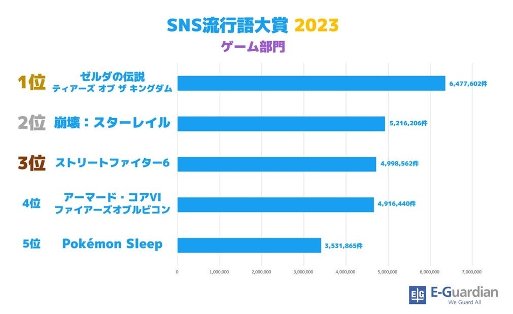 ゲーム部門1位は『ゼルダの伝説 ティアーズ オブ ザ キングダム』。600万件以上の話題量を獲得し、2位と100万件以上の差をつける結果となりました。ゲーム内に登場する「コログ」のセリフ「もう疲れちゃって 全然動けなくてェ…(コログ構文)」がノミネートワード30に選出されるなど人気と影響力の強さがうかがえます。