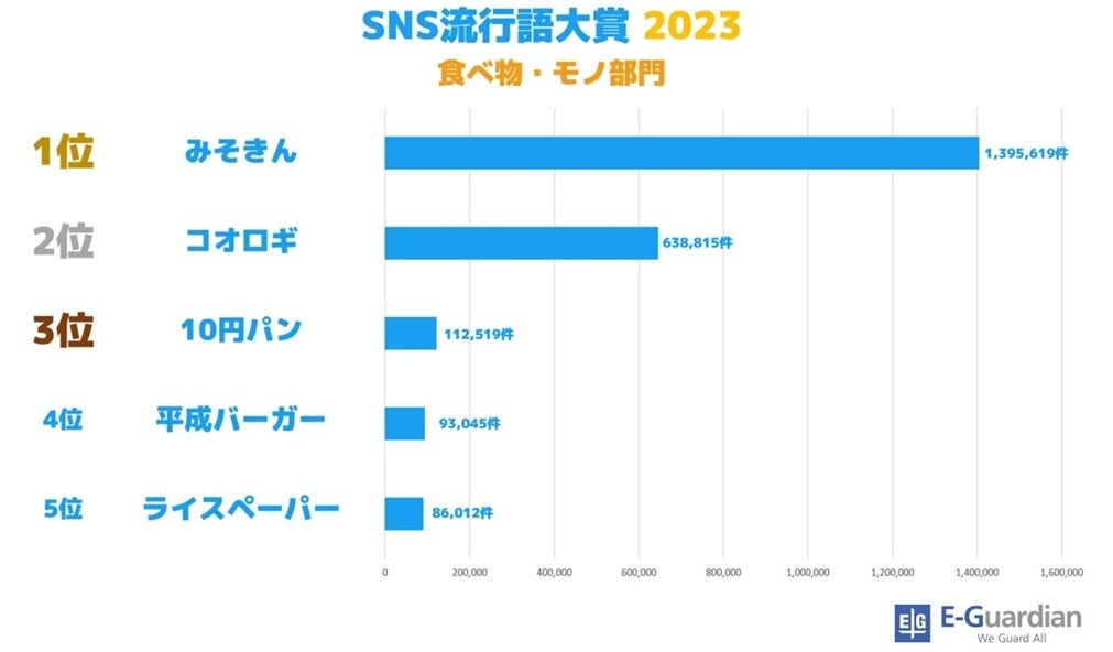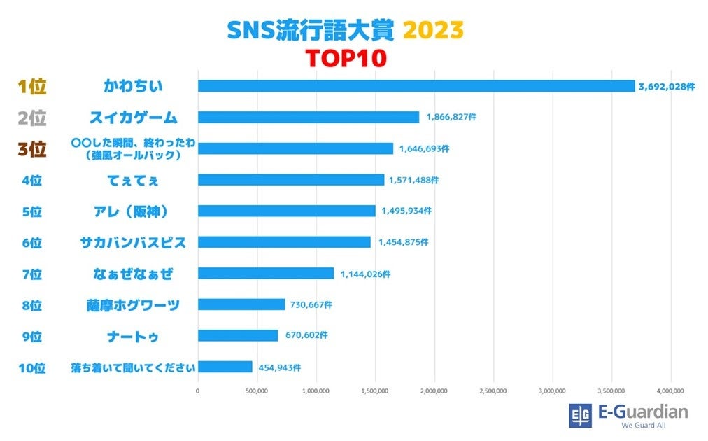 イー・ガーディアン株式会社(https://www.e-guardian.co.jp/ 東京都港区 代表取締役社長:高谷 康久 以下、「イー・ガーディアン」)は、2023年X(旧Twitter)上で頻繁に使用されたフレーズを調査し最もつぶやかれたフレーズである「SNS流行語大賞 2023」(2023年1月1日~2023年10月31日)を発表いたします。今年の大賞は、累計360万回以上つぶやかれ2位に大差をつけた『かわちい』に決定いたしました。またカテゴリごとに、ゲーム部門は『ゼルダの伝説』、漫画・アニメ部門は『機動戦士ガンダム』、ドラマ・映画部門は『シン・仮面ライダー』、食べ物・モノ部門では『みそきん』が1位に輝きました。
