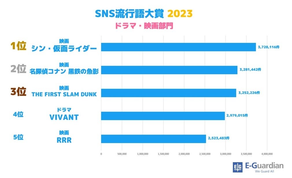 ドラマ・映画部門では、仮面ライダー生誕50周年記念作品、映画『シン・仮面ライダー』がトップに。映画の詳細を伏せたまま公開された本作ですが、歴代の仮面ライダー映画史上最高記録&初の興行収入20億円突破の快挙を成し遂げ話題となりました。そして、『名探偵コナン 黒鉄の魚影』『THE FIRST SLAM DUNK』が僅差で2位・3位と続き、4位には『VIVANT』がドラマで唯一ランクイン。先の読めない展開に期待する視聴者が多く、放送のたびにトレンド入りしていました。5位の『RRR』は、作中に出てくる超高速ダンス「ナートゥダンス」が注目され、総合TOP10にもランクインしています。