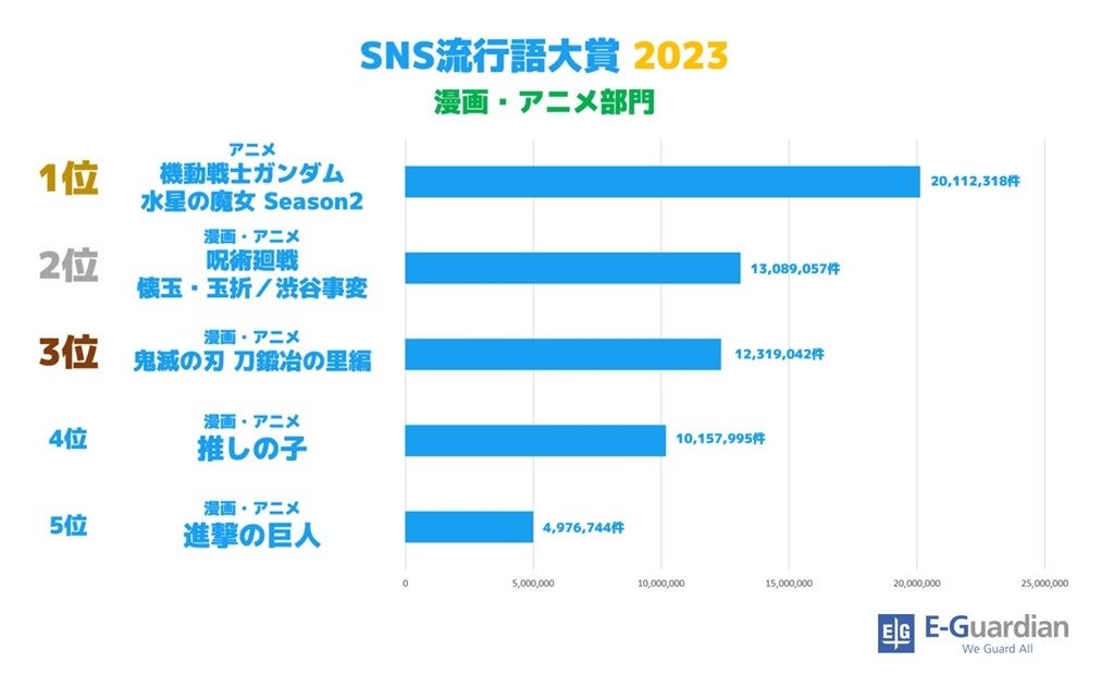 漫画・アニメ部門は、『呪術廻戦』や『鬼滅の刃』などのメジャータイトルが並ぶ中、『機動戦士ガンダム 水星の魔女 Season2』が1位に。Season1が放送された昨年も漫画・アニメ部門でランクインしていましたが、その勢いは留まることを知らず2023年も人気を博しているようです。今年の漫画・アニメ部門は、以前から人気のある作品のテレビ放送や最終回をきっかけにした “再燃” が多い傾向にありました。