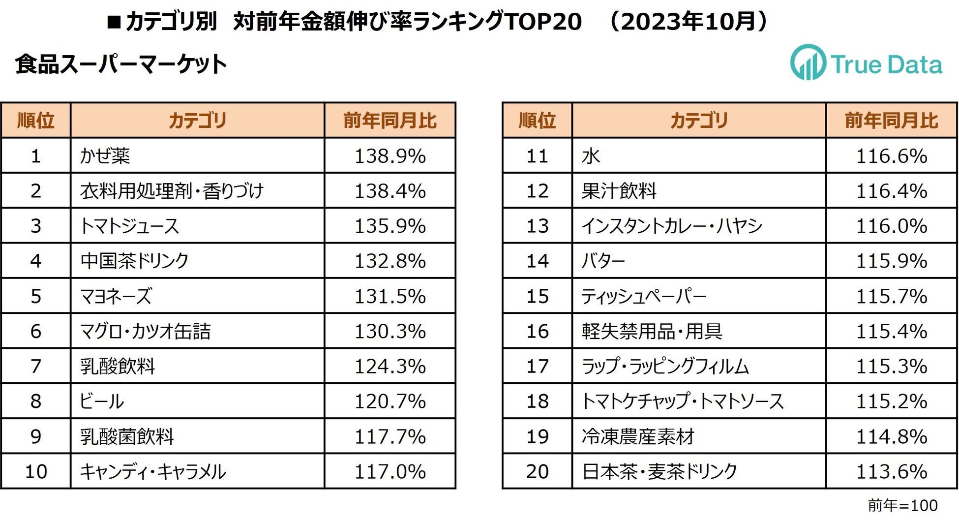 ビッグデータプラットフォームを運営する株式会社True Data(トゥルーデータ/本社:東京都港区、代表取締役社長:米倉 裕之、証券コード4416)は、当社の統計データをもとに、ドラッグストア、食品スーパーマーケットにおける2023年10月の売り上げ伸長カテゴリを発表します。当月は、「ビール」の売り上げが前年同月と比べ増加しました。「ビール」は2023年10月から酒税が引き下げられた影響と、前年2022年10月の値上げによる売上減の反動で、食品スーパーマーケットで売上金額が前年同月比20.7%増加、ドラッグストアで同15.4%増加しました。前年の値上げと当年の減税により価格変動が起こった「ビール」は、需要が伸びる年末年始にどのような購買行動が見られるかが注目されます。