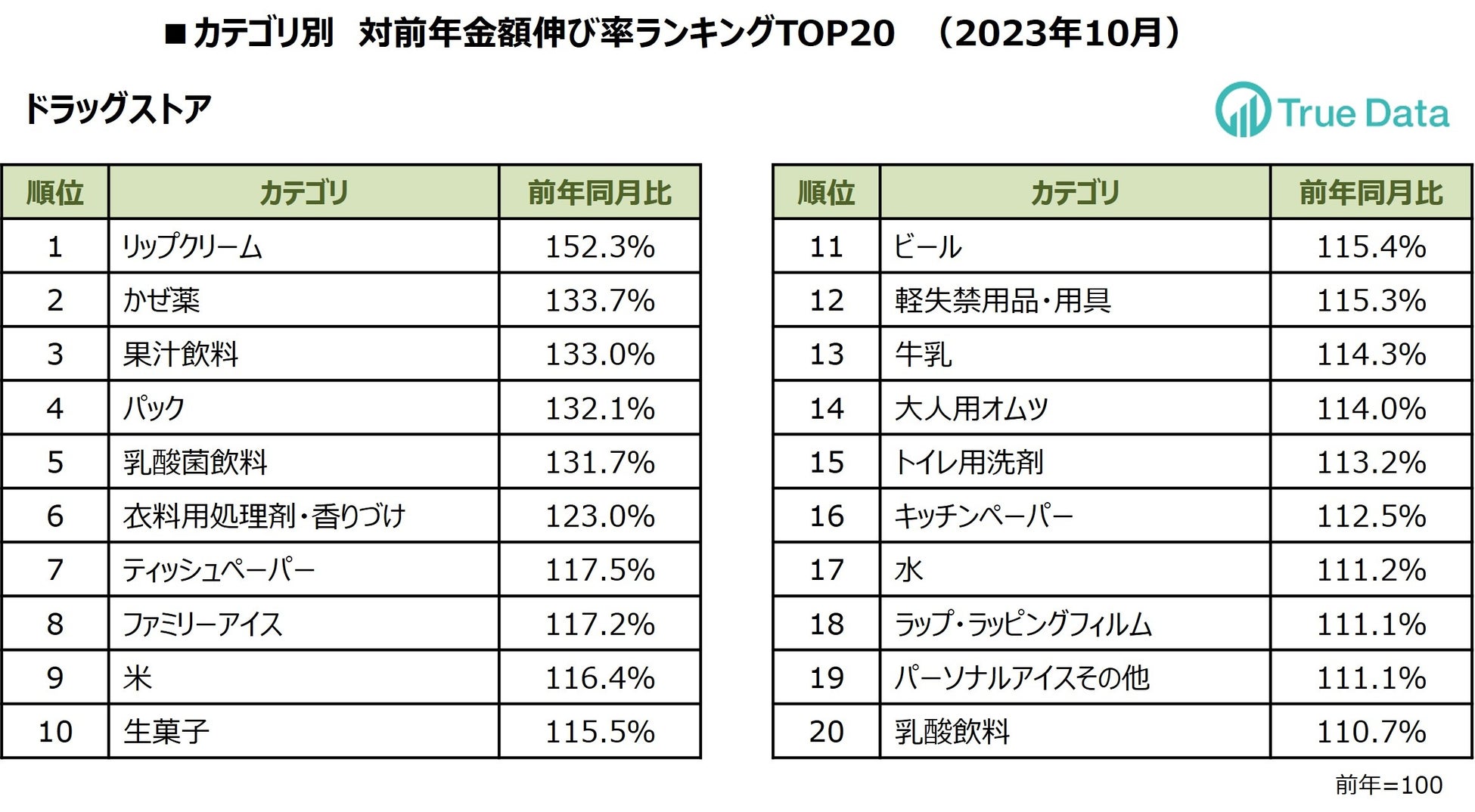 ドラッグストアで「リップクリーム」の売り上げが前年同月と比べ52.3%増加し、前月に続き伸び率ランキングの1位を記録しました。「リップクリーム」は冬に向けて売り上げが増加する商品のため、本格的に寒くなる11月以降も前年超えの売り上げが続くか注目されます。