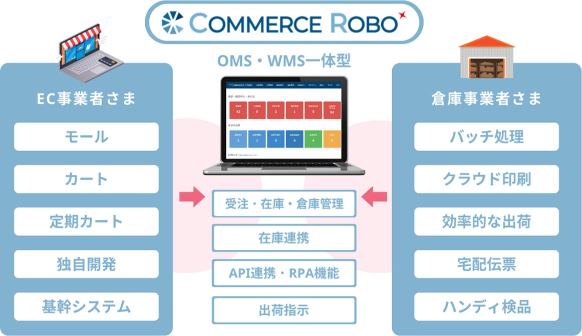 『コマースロボ』とは、受注管理システム(OMS)と倉庫管理システム(WMS)が一体型となった、eコマース専用の自動出荷クラウド型システムです。RPA(特許取得)も内蔵しており、様々なカート・モールでの受注データをAPIで自動取得し、それらの出荷指示データをWMSに連携することが可能です。