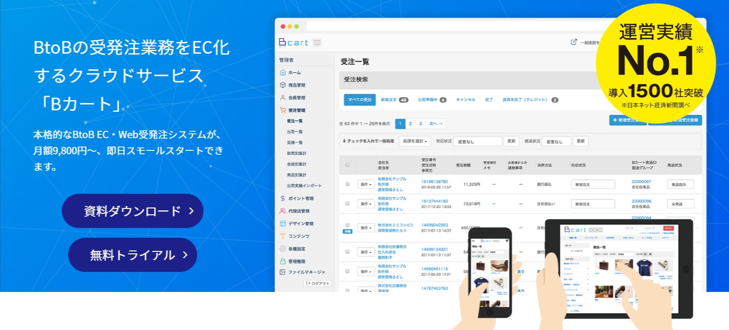 『Bカート』(https://bcart.jp/)は運営実績No.1(※日本ネット経済新聞社調べ)のBtoBの受発注業務をクラウド化するカートサービスとして導入実績1500社超、延べ60万社超の法人及び事業者の取引にご利用いただいております。また本格的なBtoB-EC・Web受発注システムが、月額9,800円~、即日でスモールスタートできるサービスです。我々 Bカートは、『はたらくを変える』というミッションのもと、BtoB-EC業界の発展に貢献してまいります。