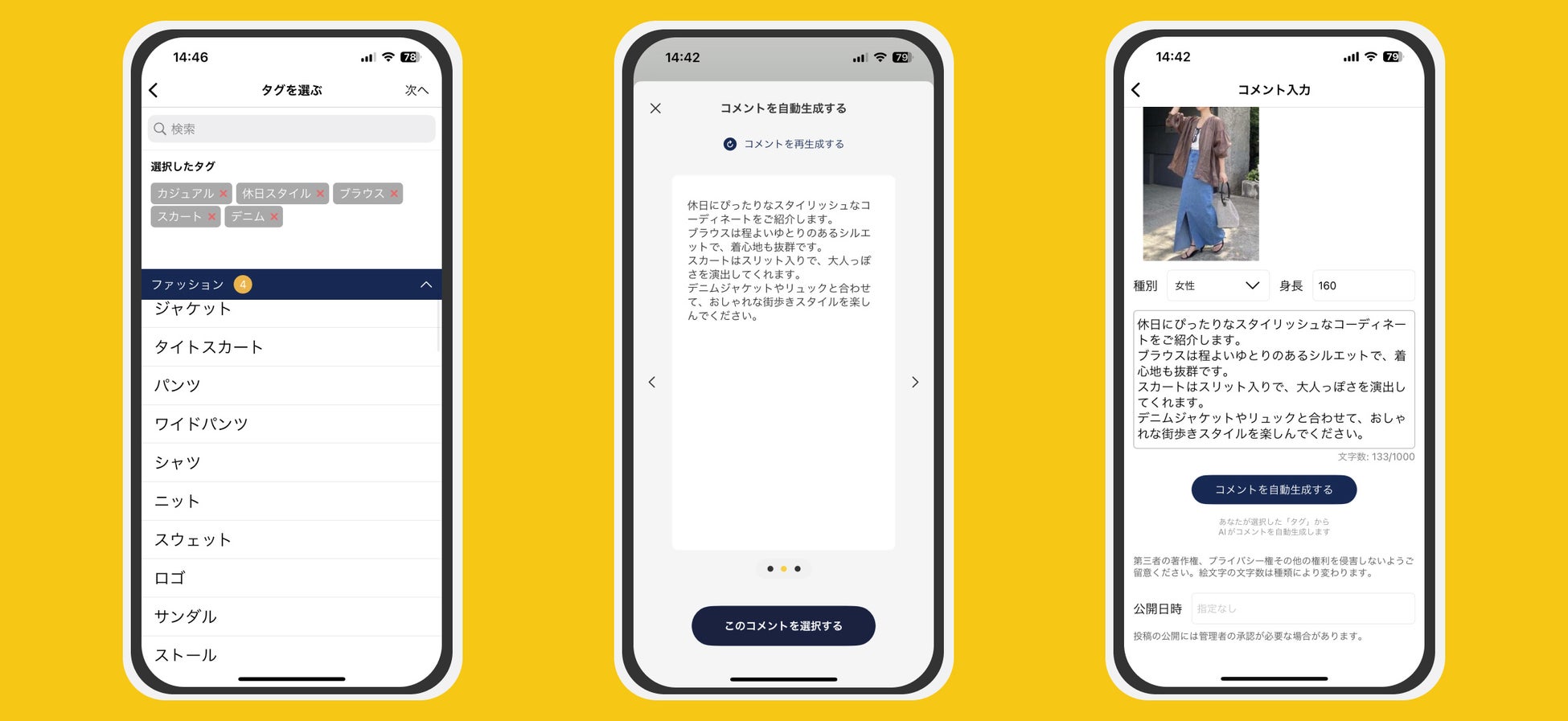 今回のコメント下書き作成機能は、写真や動画の伝えたいポイントに沿ったタグを選択すると、AIによって自動でコメントの素案を複数生成する機能です。自身が最もイメージするものに近い素案を選択して投稿文に挿入ができ、自身のオリジナリティを付加した投稿文の作成をアシストします。