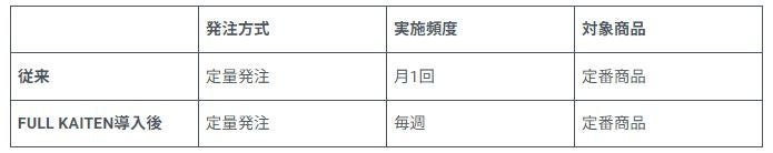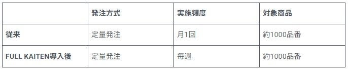 FULL KAITENで算出した予測値や発注点を参考にして、発注点のメンテナンスを頻繁に行うことができるようになりました。業務効率化して生み出した時間を活用し、FULL KAITENで算出した数字を吟味する時間を設けることができるようになり、定量成果に繋がりました。