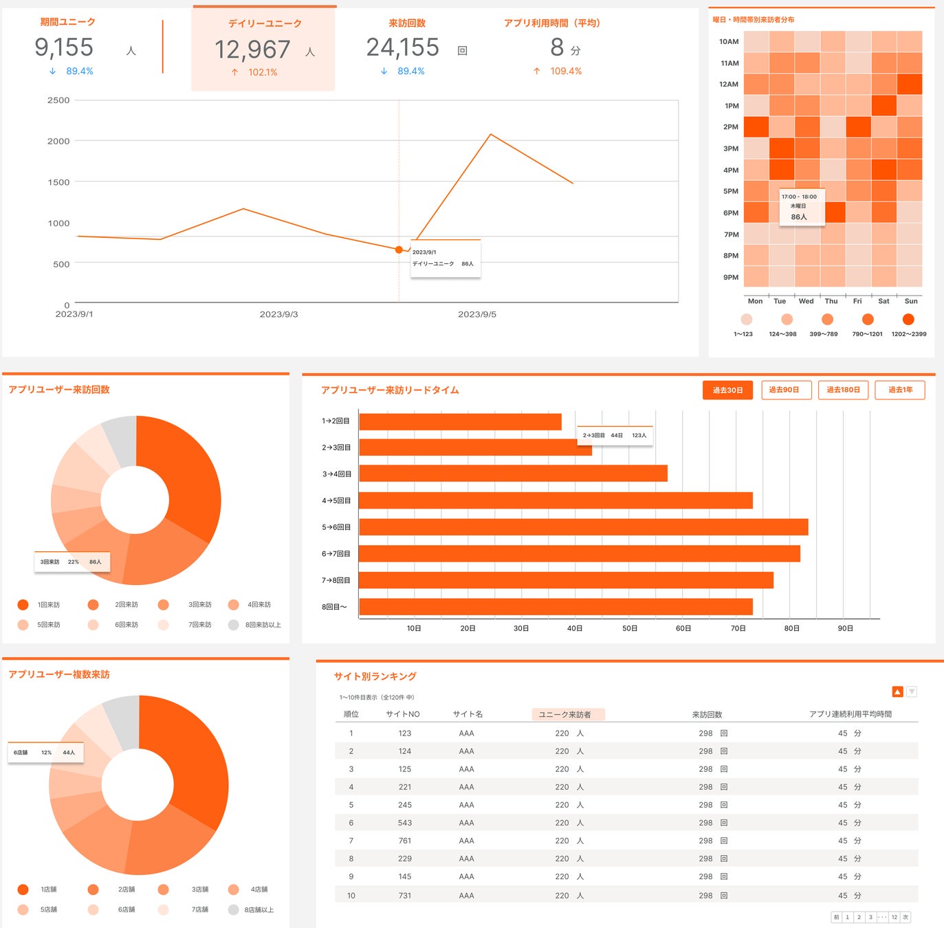 また、「Store360」ではオフラインIoTデバイスを活用する事でアプリユーザーだけでなく来店者数の計測もできるため、来店率、来店アプリユーザーシェア、購買率など店舗の来店行動データを定量的に分析する事がでるようになりアプリユーザーの行動データを掛け合わせて分析、マーケティング施策を実行することが可能になります。