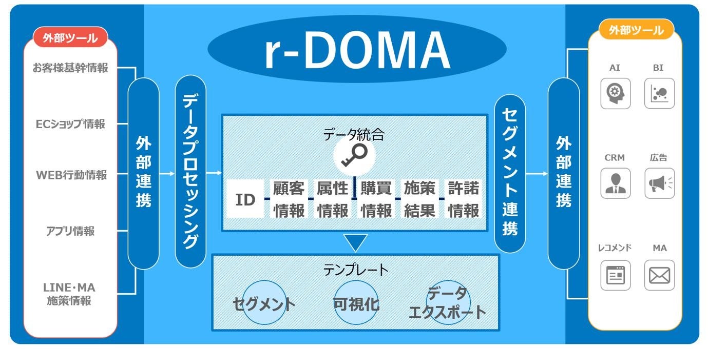 この度、新たに提供を開始する小売業界向けの「r-DOMA」では、データプロセッシングやデータエクスポートなどの標準機能に加え、ECサイト購買情報・会員情報・商品情報・サイト閲覧情報や、アプリのインストール情報、LINEプッシュなどの施策情報、実店舗の情報など、小売業界固有のデータにアクセスするコネクタをもち、各データを顧客ID(カスタマーID)で統合する機能を有しています。またコア技術に、Amazon Web Services※2のサーバレス技術を採用し各機能を実装することで、クライアント企業の環境における多様なデータへのアクセスにおける柔軟性と可用性を実現しつつ、コスト最適化のバランスを維持しています。
