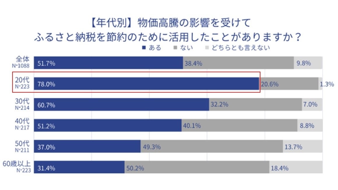 20 代の若い世代は、ふるさと納税を地域への応援手段として認知しており、寄付することで地域への貢献を感じていると考えられます。ふるさと納税でしか出会えない希少な特産品や、地場での体験に対して他の世代よりも関心が高いのも特徴であると同時に、社会情勢や経済状況などの影響が寄付行動に強く出る世代でもあります。今後の地域支援の流れをけん引する存在として、ますます存在感を増していくことが予想されます。また、「地域の若者×自治体」の共創型GCF®プロジェクトが多数登場し、若者のアイデアを基にした、ふるさと納税の活用が進んでいます。