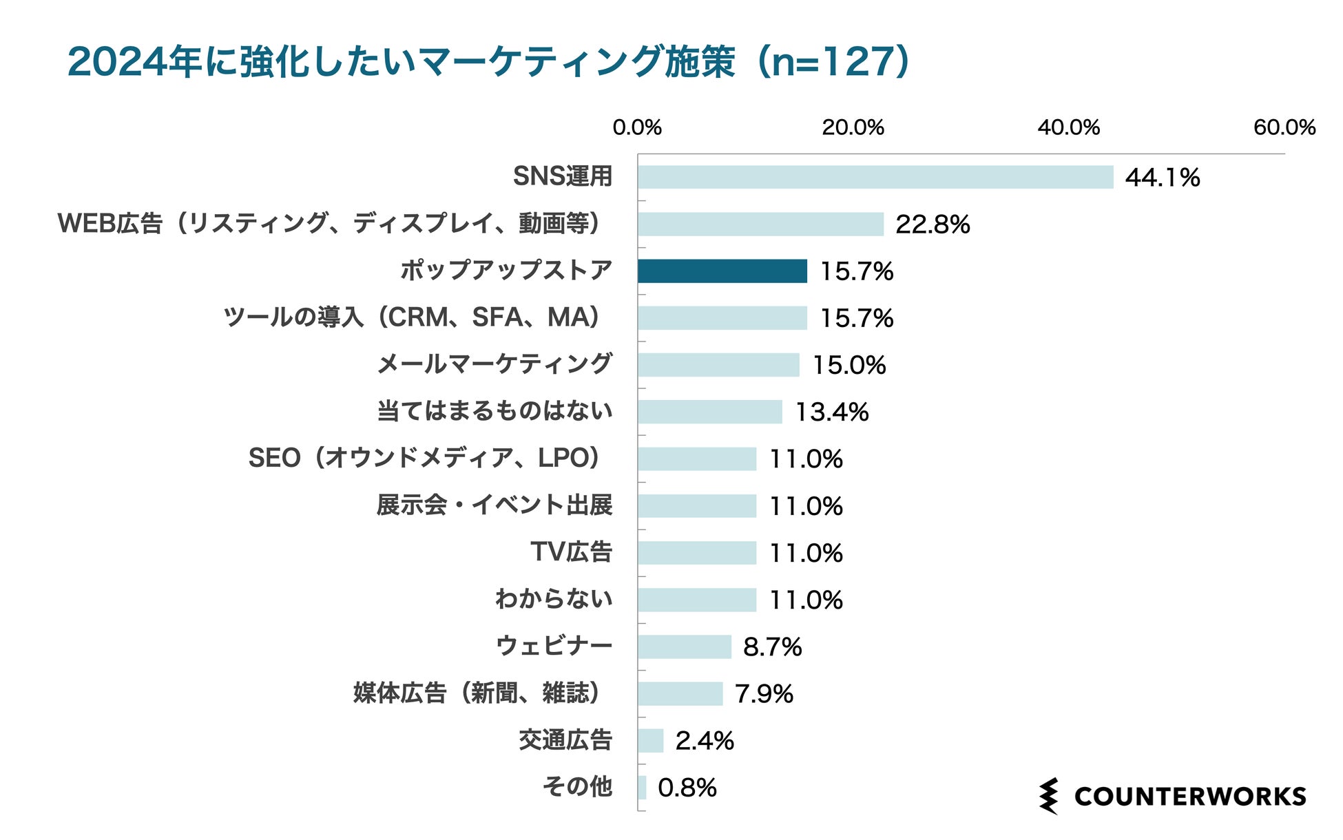 カウンターワークスは、企業のマーケティング・宣伝・広報担当者127人に対して、2024年に強化したいマーケティング施策を尋ねたところ、「SNS運用」(44.1%)が最も多く、次いで「WEB広告(リスティング、ディスプレイ、動画等)」(22.8%)、3位は同率で「ポップアップストア」「ツールの導入(CRM、SFA、MA)」(15.7%)となりました。D2Cの台頭に加え、アフターコロナによりオフラインでの顧客接点を重視する動きが広がる中、ポップアップストアの注目が高まってきてると言えるでしょう。