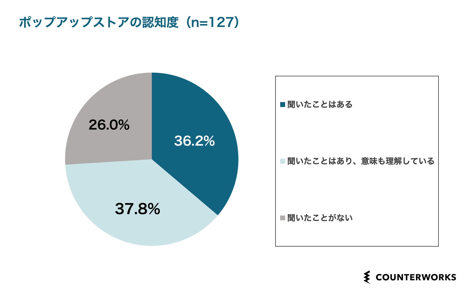 続いて、“ポップアップストア”というワードに対する認知状況を尋ねたところ、「聞いたことはある」は36.2%、「聞いたことはあり、意味も理解してる」といったより深い認知は37.8%となり、それらを合計すると認知度全体は7割超の結果となりました。