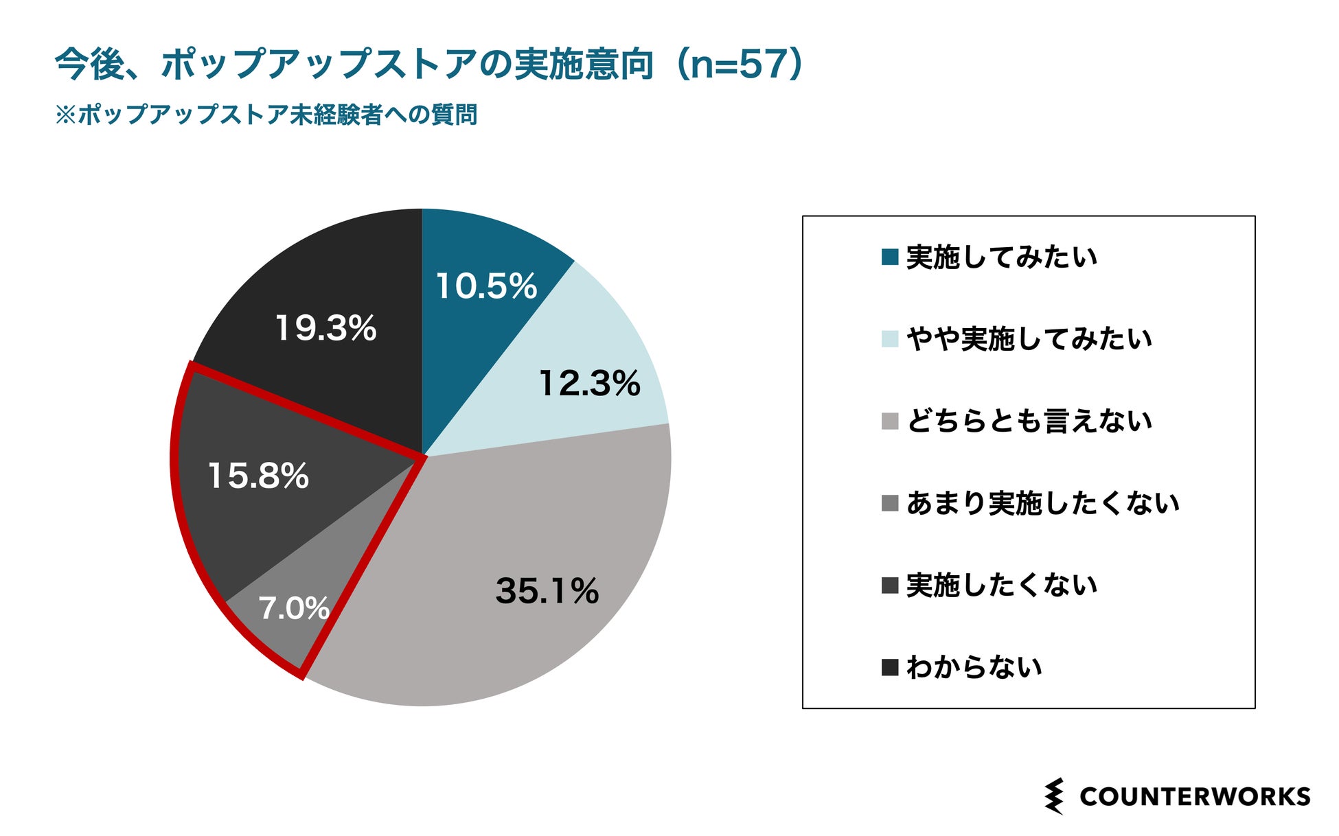 “ポップアップストア”の未経験者に対して、今後の実施意向を尋ねたところ、「実施してみたい」(10.5%)、「やや実施してみたい」(12.3%)と約2割が興味を示すものの、「実施したくない」(15.8%)、「あまり実施したくない」(7.0%)というように同じく2割近くが実施に対して消極的であることも明らかになりました。