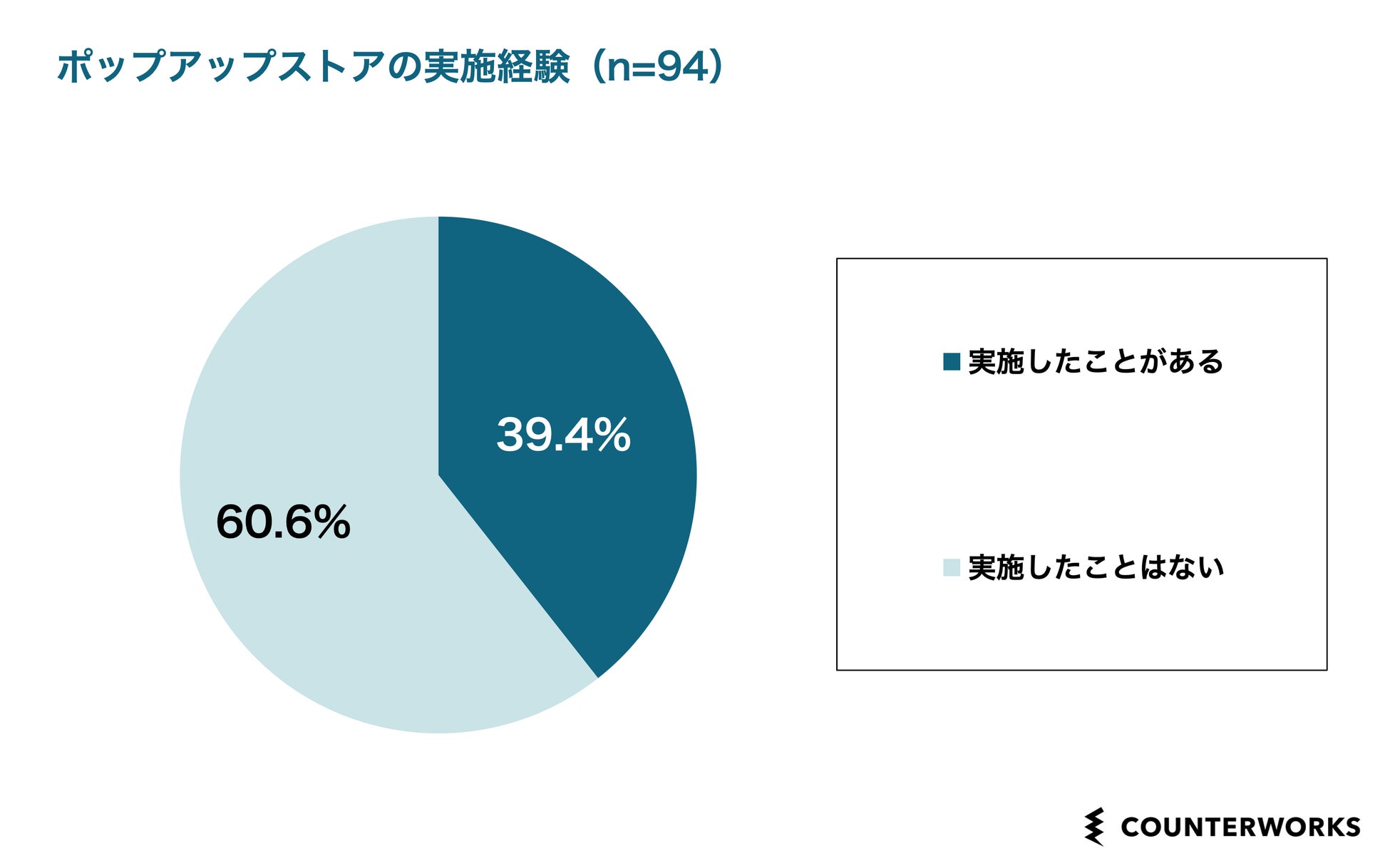 さらに“ポップアップストア”を認知している人に対して、その実施経験を尋ねたところ、「実施したことがある」(39.4%)人は約4割いました。企業の担当者にとっても、マーケティング施策として浸透しつつあることが伺えます。