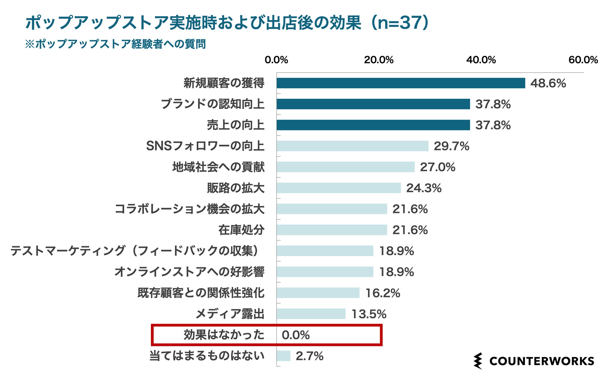- (4)一方、ポップアップストア経験者の出店後の効果、1位「新規顧客の獲得」、2位は同率で「ブランドの認知向上」「売上の向上」。「効果がない」と回答した人はゼロ