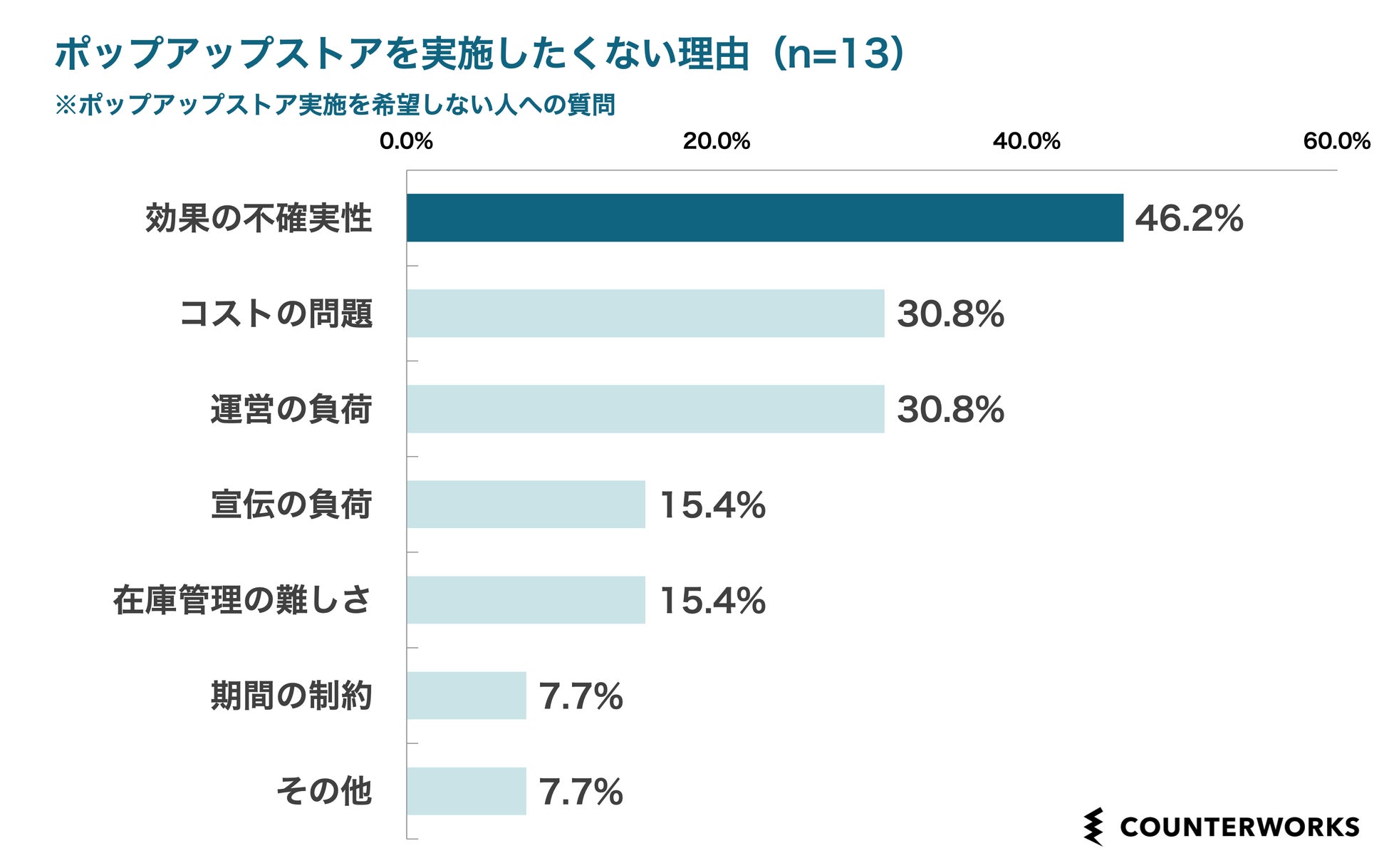 そのような、“ポップアップストア”消極派に対して実施したくない理由を尋ねたところ、「効果の不確実性」(46.2)が最も多く、「コストの問題」、「運営の負荷」(30.8%)が同率で続きました。