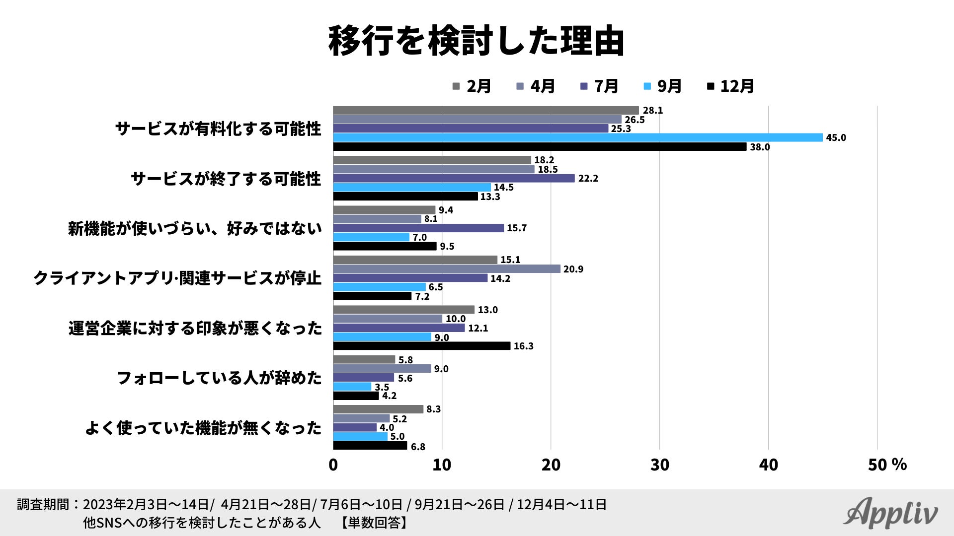 - 移行検討理由1位は「Xが有料化する可能性」、「運営企業に対する印象が悪化した」は過去最高