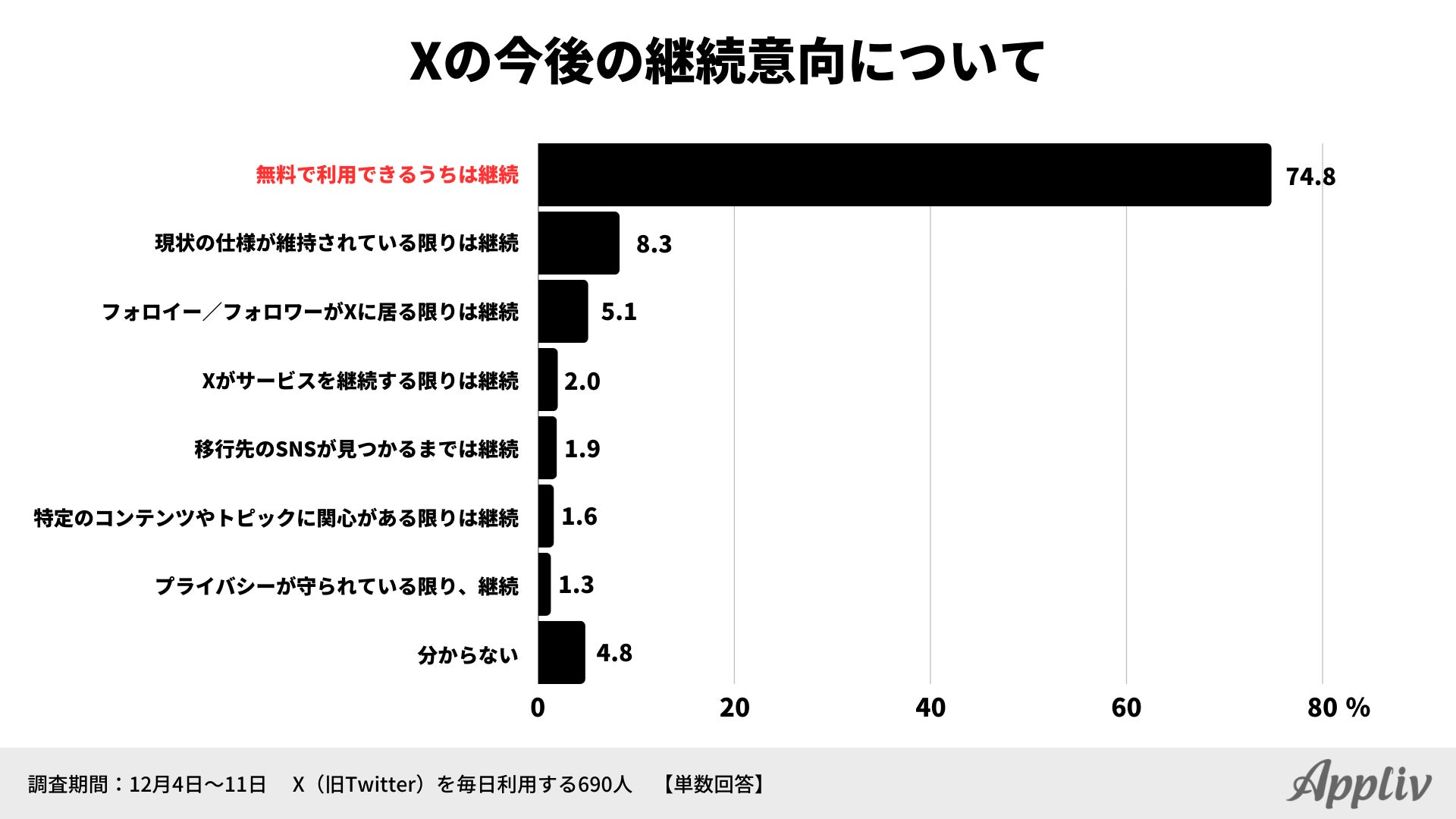 Xの今後の利用意向について調べてみると、最多は「無料で利用できるうちは継続する」で74.8%となっており、さきほどの有料プランに加入していない割合を上回る結果となりました。