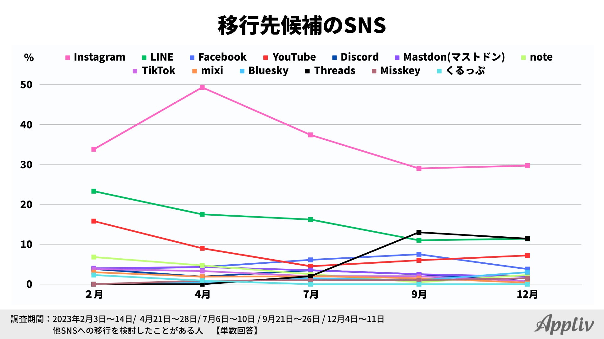 『Threads』は2023年7月6日にサービスを開始し、7時間で登録者1,000万人を突破、その注目度の高さが話題となりました。前回調査(13.0%)から2ptほど減少していますが、移行先候補としてはInstagramに次ぐ2位をキープしています。