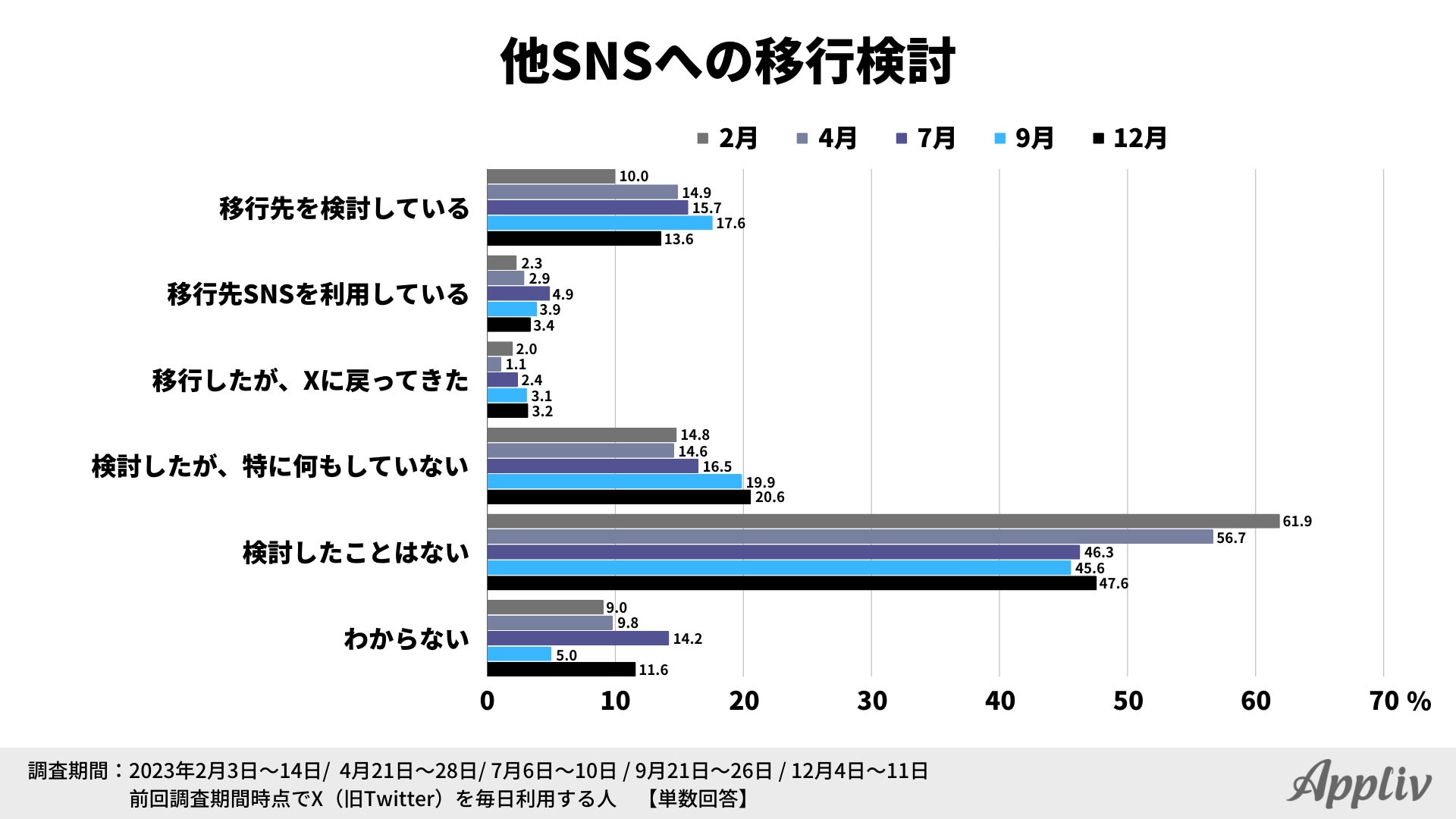 「移行を検討している」と回答した割合は13.6%と、調査を開始して以来初めて減少する結果となりました。Xの利用継続意向が今後高まっていく可能性も考えられそうです。