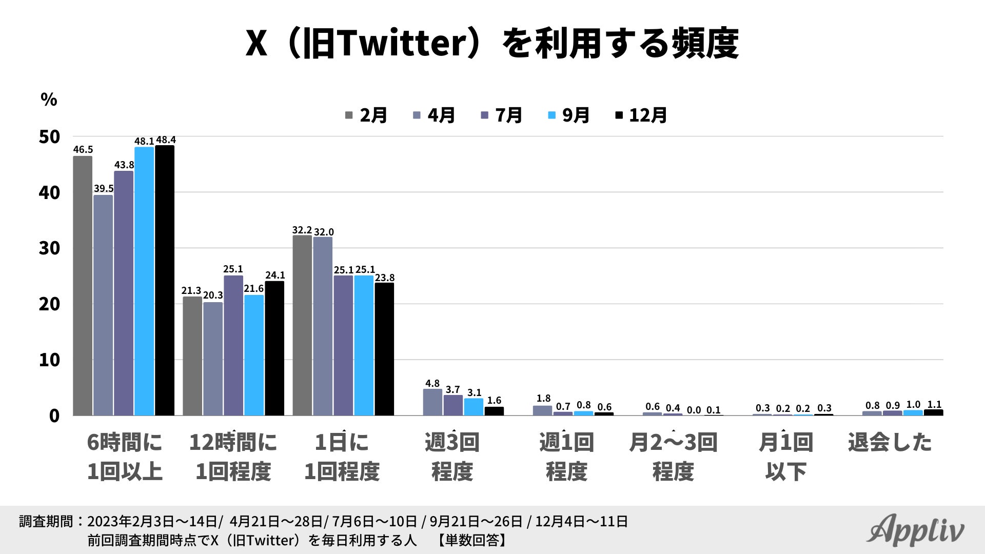 ナイル株式会社(本社:東京都品川区、 代表取締役社長:高橋飛翔、 以下ナイル)が運営するスマートフォンユーザー向けアプリ情報メディア「Appliv(アプリヴ)」にて、2023年12月4日~12月11日の期間で、X(旧Twitter)の利用状況に関するアンケート調査を実施しました。
