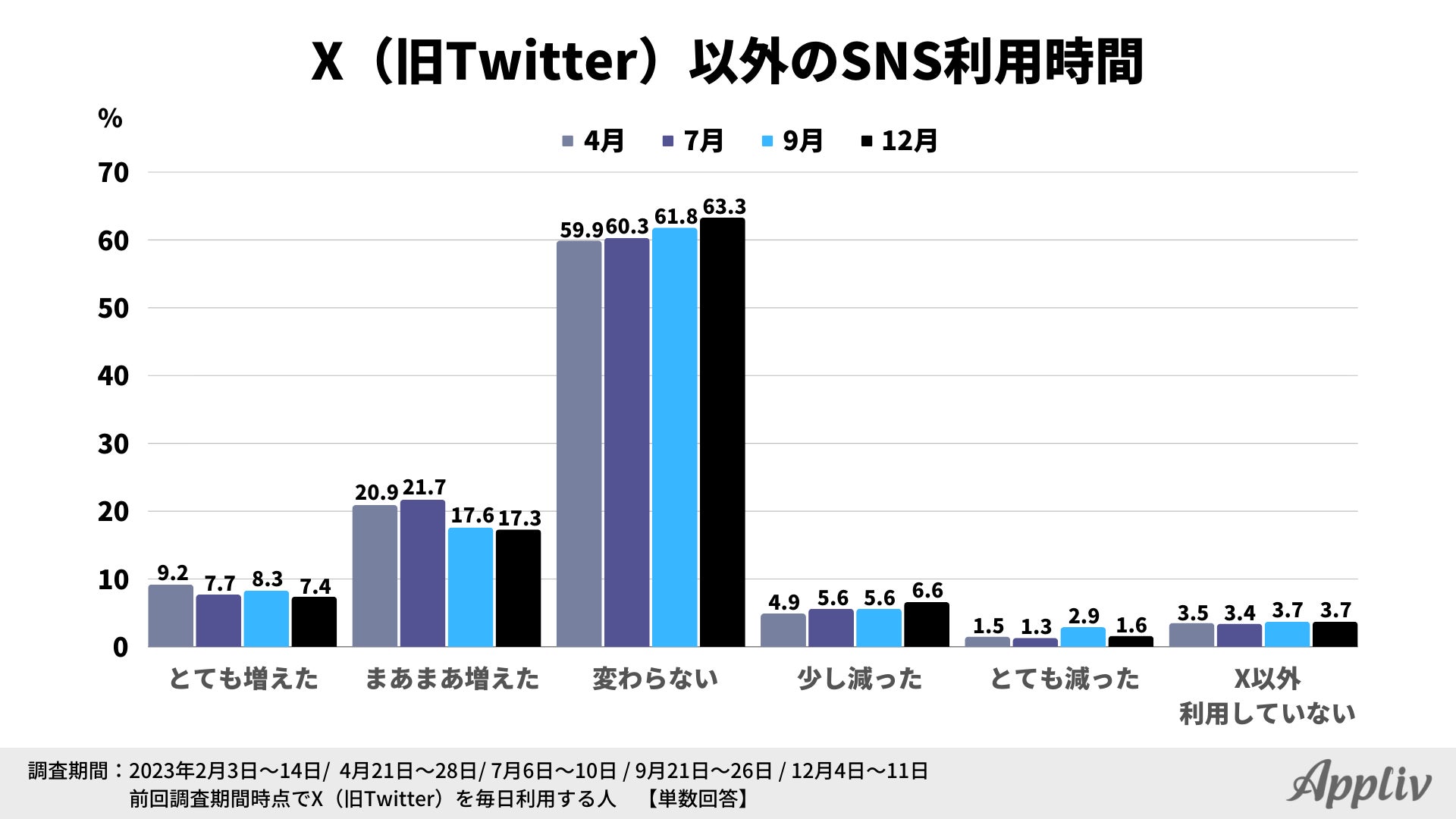 続いて、2023年9月以降にX以外のSNS利用時間はどのように変化したかを尋ねたところ、こちらも過去4回の調査結果と同じく、6割以上が「変わらない」と回答しています。