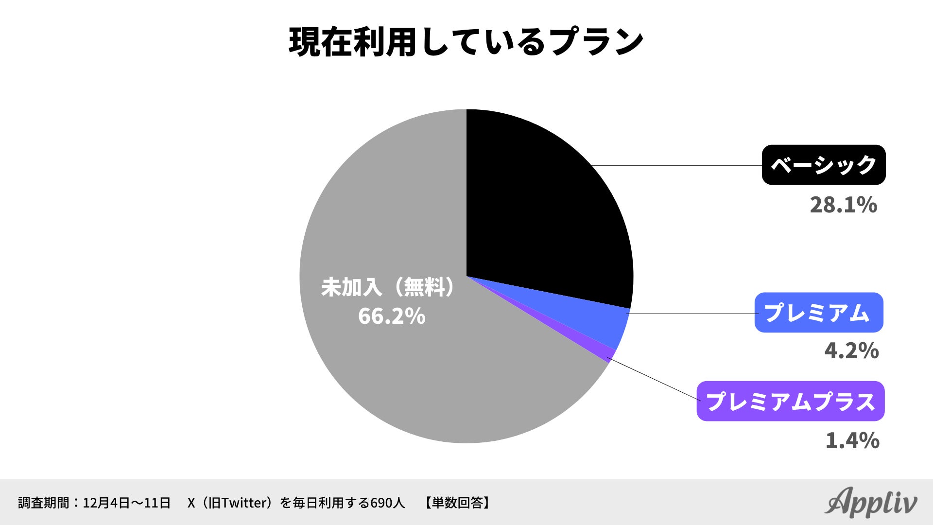 Xは10月27日、新たなプランとして「ベーシック」と「Xプレミアムプラス」の提供を開始しました。各プランの利用状況について聞いてみたところ、「ベーシックプラン(月額368円)」が28.1%、「プレミアム(月額980円)」が4.2%、「Xプレミアムプラス(月額1,960円)」が1.4%でした。