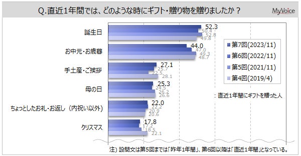 「誕生日」が52.3%、「お中元・お歳暮」が44.0%、「手土産・ご挨拶」「母の日」「ちょっとしたお礼・お返し」が各20%台、「クリスマス」が17.8%です。