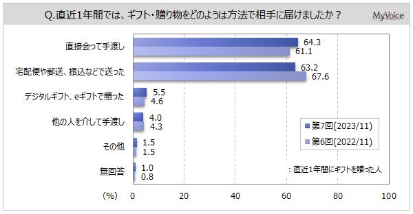 ■ギフトを届けた方法は、「直接会って手渡し」「宅配便や郵送、振込など」が直近1年間に贈った人の各6割強