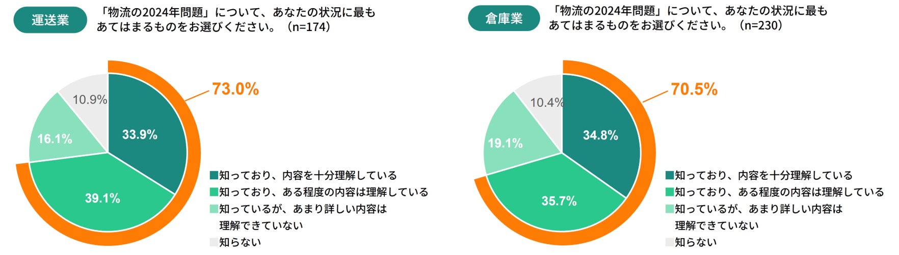 「知っており内容を十分理解している」と回答した人は運送業(総合物流+道路貨物輸送)で33.9%、倉庫業(総合物流+倉庫)で34.8%にのぼります。「知っており、ある程度の内容は理解している」まで含めると業界全体で7割以上が「物流の2024年問題について内容を理解している」という結果になりました。「物流の2024年問題」への関心度は業界全体的に高いといえます。