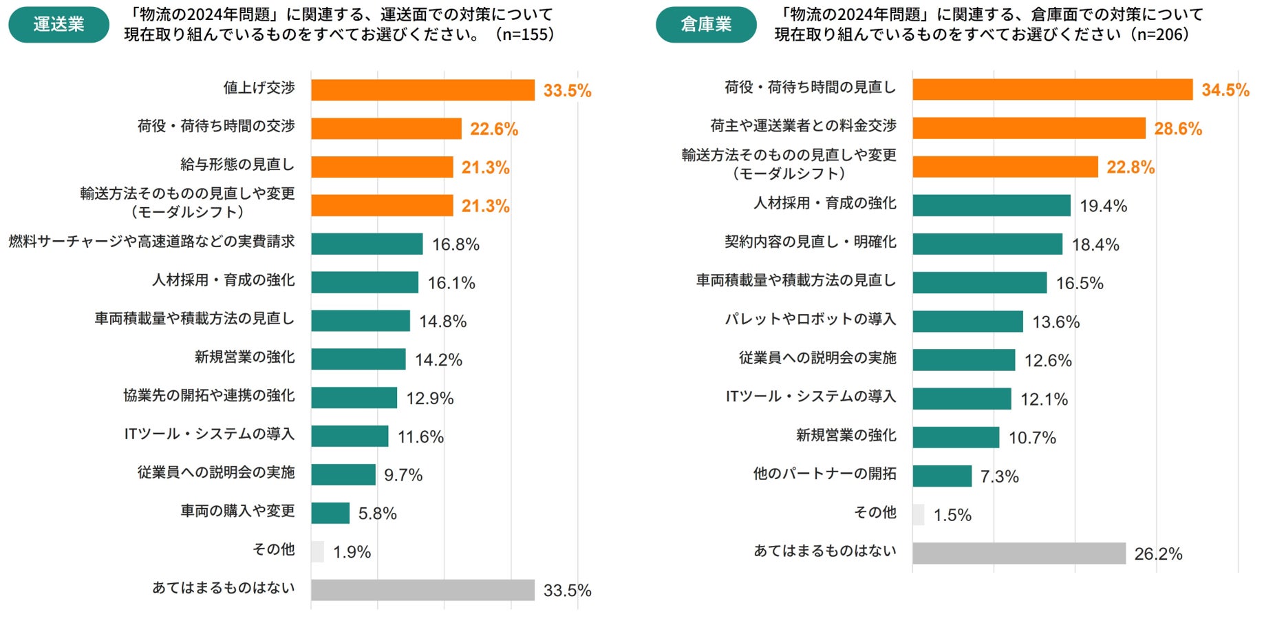 - 運送業での対策は「値上げ交渉」が1位、倉庫業では「荷役・荷待ち時間の見直し」が対策トップ