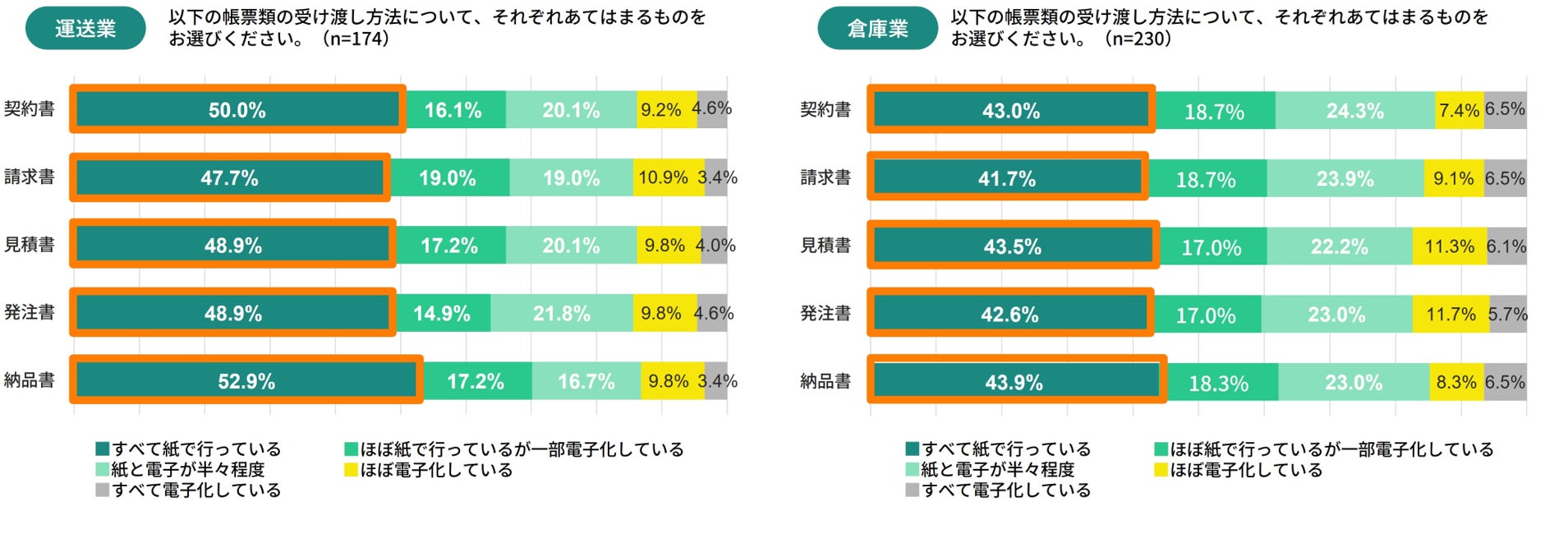 各帳票の受け渡し方法について聞くと、運送業では最も電子化が進んでいる請求書でも47.7%が「すべて紙」と回答し、納品書は52.9%と半数以上が「すべて紙」と回答しました。倉庫業でも請求書で41.7%、納品書では