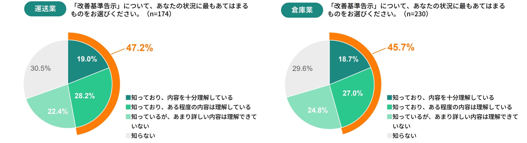 「知っており内容を十分理解している」と「知っており、ある程度の内容は理解している」を含めた数字は、運送業で47.2%、倉庫業で45.7%と、過半数の人が内容をよく知らないでいます。「改善基準告示」により自動車運転者の拘束時間の上限や休息期間等の規制が強化されますが、その認知度は「物流の2024年問題」よりも低い結果になりました。