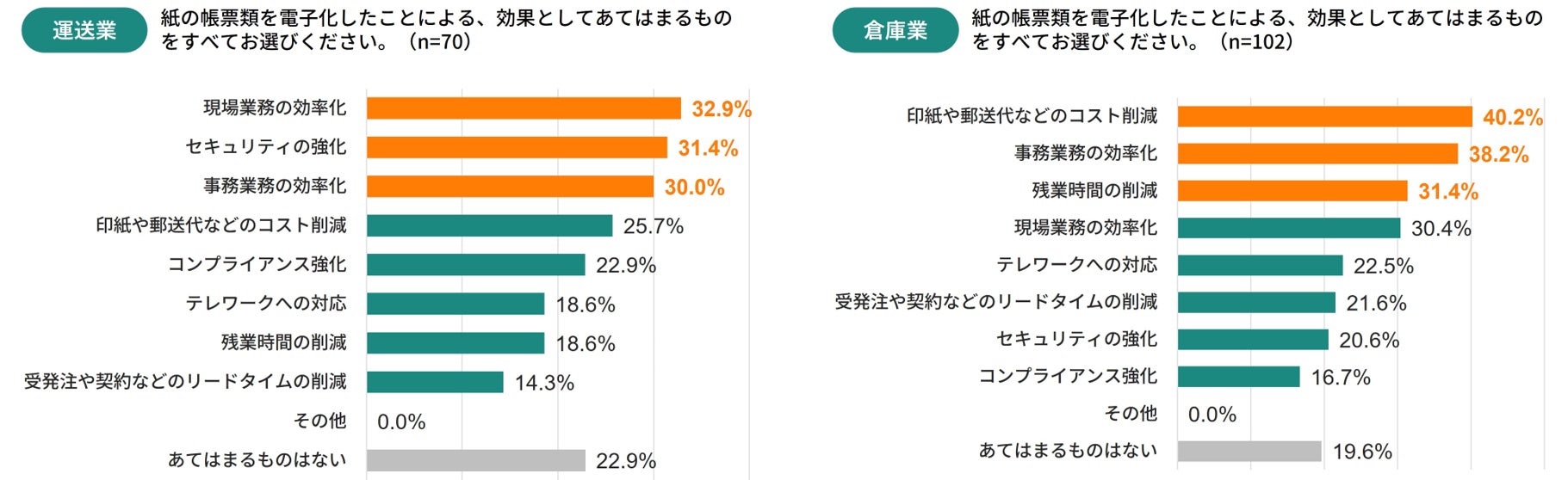 倉庫業においても、「印紙や郵送代等のコスト削減(40.2%)」、「事務業務の効率化(38.2%)」、「残業時間の削減(31.4%)」と続きます。業務が効率化されるだけでなく、印紙代や郵送代といったコスト削減にも貢献していることが分かります。