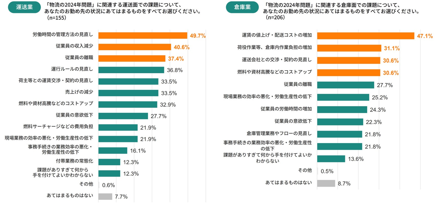 - 運送業の課題1位は「労働時間の管理方法の見直し」、倉庫業は「運賃の値上げ・配送コストの増加」