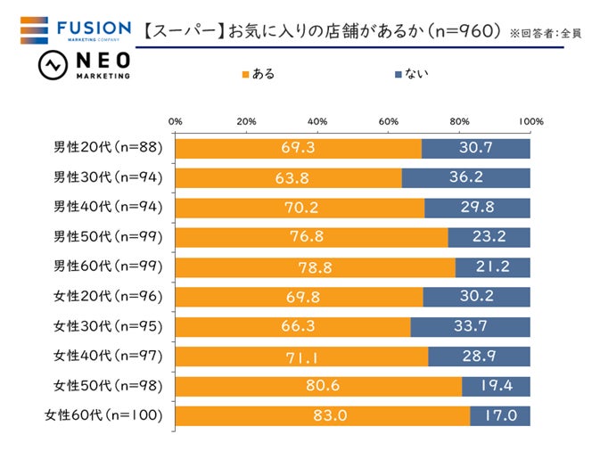 スーパーについては、どの年代も男性より女性の方が「ある」と回答した割合が高くなっており、中でも50代〜60代の女性は80%以上が“お気に入り店舗”を持っていることがわかりました。