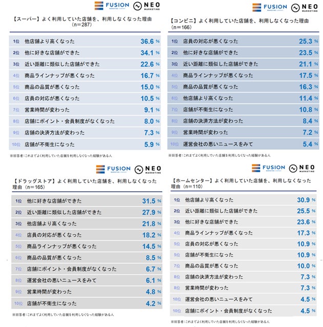 いずれも「商品ラインナップが悪くなった」や「店員の対応が悪くなった」などがTOP3に来ていないことから、その店舗の“質低下による離反”というよりも、「より近くに新店舗ができた」「より安い店舗を見つけた」「より新鮮な食材のある店舗を見つけた」など、より好条件の店舗に流れていったと考えられそうです。