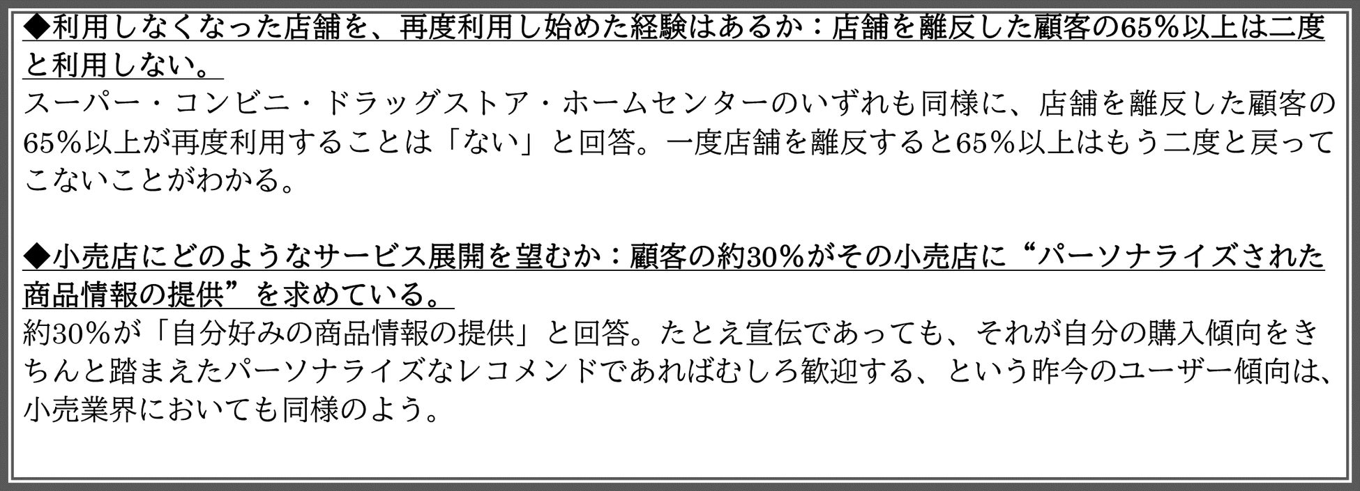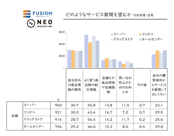 どの店舗についても、約30%が「自分好みの商品情報の提供」を望んでいることがわかりました。