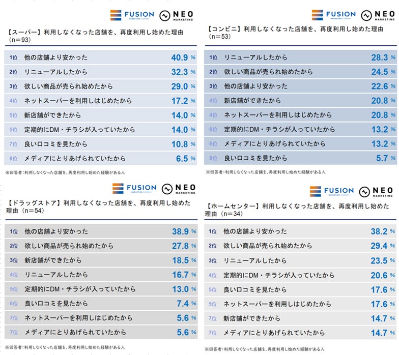 一方、離反した店舗を再び利用したことがある人にその理由を聞くと、リニューアル・新店舗オープンといった節目や、価格面が上位に挙がる中、どの店舗も「欲しい商品が売られ始めたから」がTOP3にランクインしています。