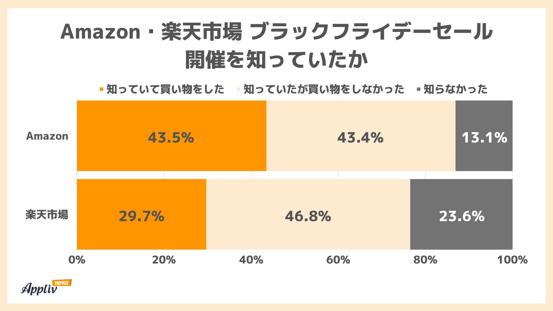 2023年11月24日〜12月1日にAmazonで、2023年11月21日〜11月27日に楽天市場で「ブラックフライデー」を冠したセールが実施されていたことを知っているかを尋ねました。