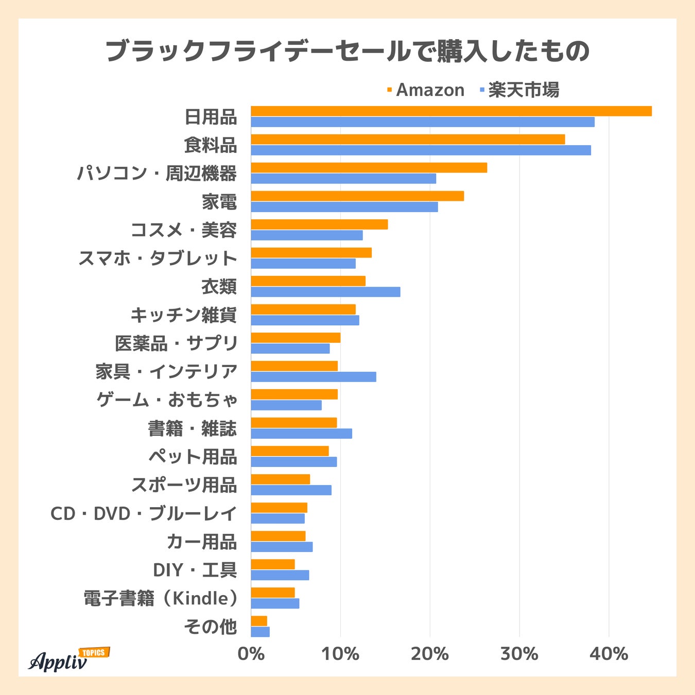 - ブラックフライデーで購入したもので人気は「日用品」「食料品」「パソコン・周辺機器」「家電」。