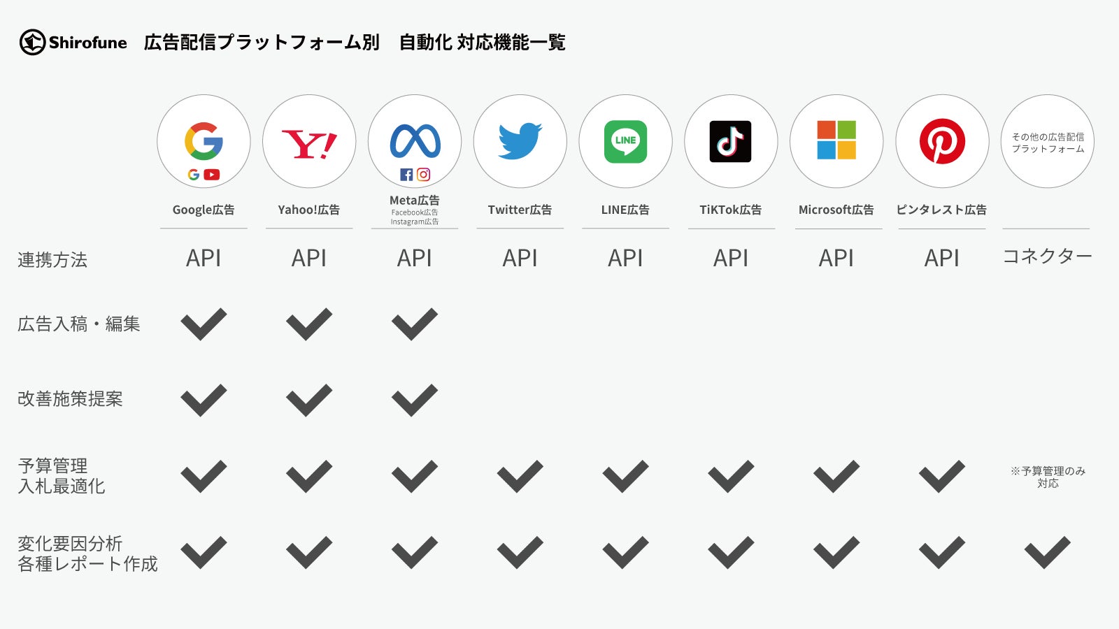 Shirofuneは、「1日10分でプロ品質の広告運用」を実現する、広告運用自動化ツールです。