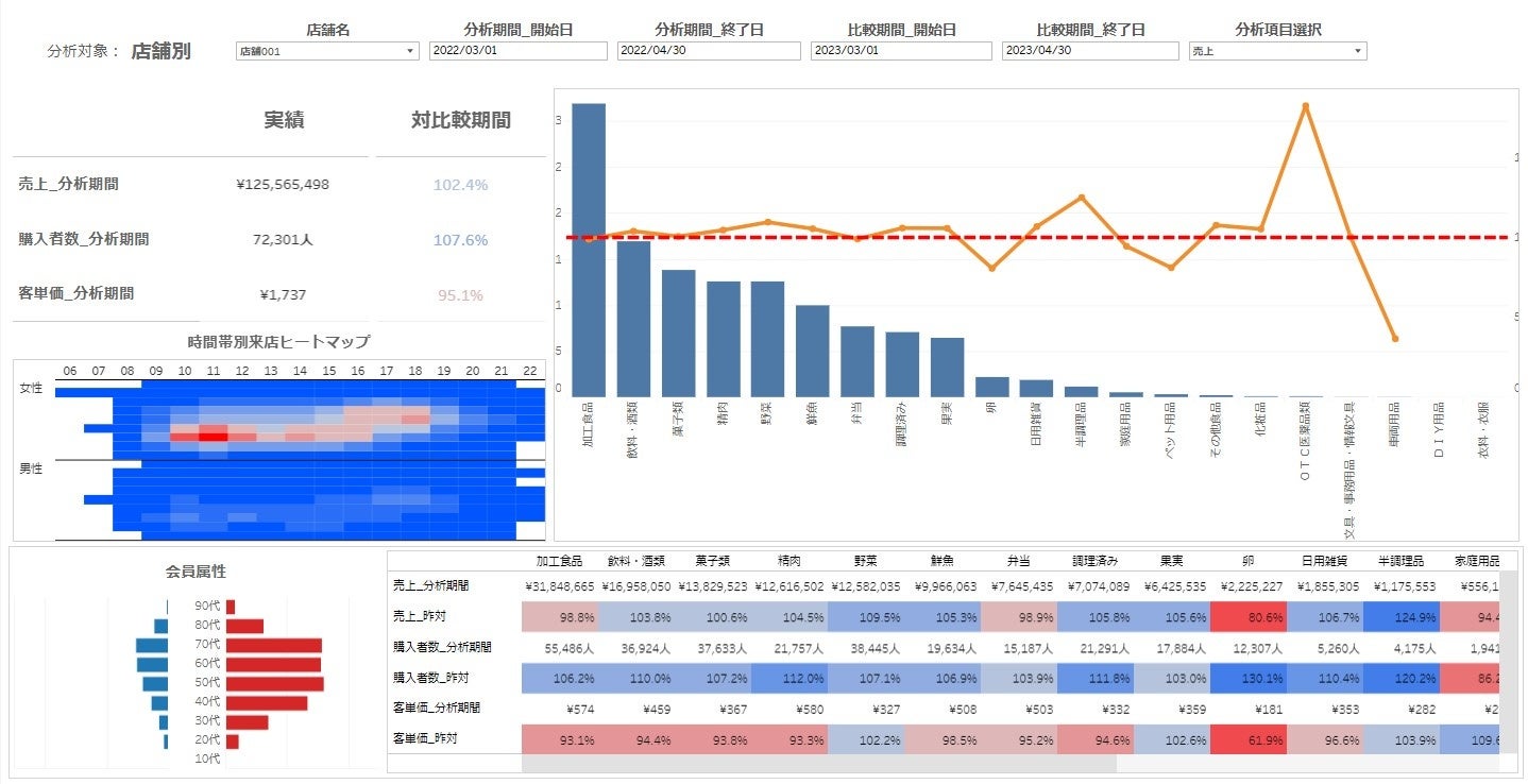 本ツールの特徴は、わずか数クリックで必要なデータが表示される簡便なダッシュボード機能と、もっと売れそうな商品をさがすことができる商品ポテンシャルAI機能を搭載している点です。ダッシュボード機能では、店舗ごとの売上実績、顧客属性(性年代)ごとの購買傾向などが把握できるほか、統計化された市場データとの比較により、自社の売れ筋と該当エリアの市場の売れ筋との比較も可能です。商品ポテンシャルAI機能では、AIを使って自社のお客様の購買履歴を分析することで、もっと売れる可能性が高い商品をリストアップして、品揃えや販売促進のヒントを得ることができます。