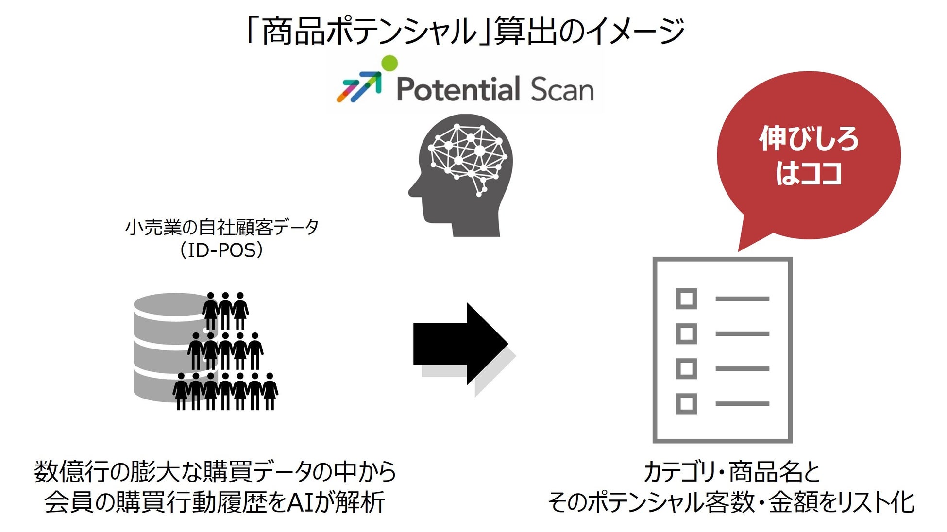 当社は、20年以上にわたる小売業のデータ活用パートナーとして、専門家だけがデータ分析するのではなく、現場で働くあらゆる人が簡単にデータから示唆を得て、スピーディーに行動に移せることが必要だと感じていました。 この課題を解決するためITを駆使した小売流通業のデジタル改革に取り組んでいる今村商事と連携して、データ分析やマーケティング部署を持たない小売業でも、売上アップの伸びしろがどこにあるのかを視覚的に把握することができるツール「Potential Scan」を開発しました。最新のAIテクノロジーを使ったID-POS分析手法を小売業の現場へ浸透させるDX研修「営業DDX」も組み合わせて提供してまいります。