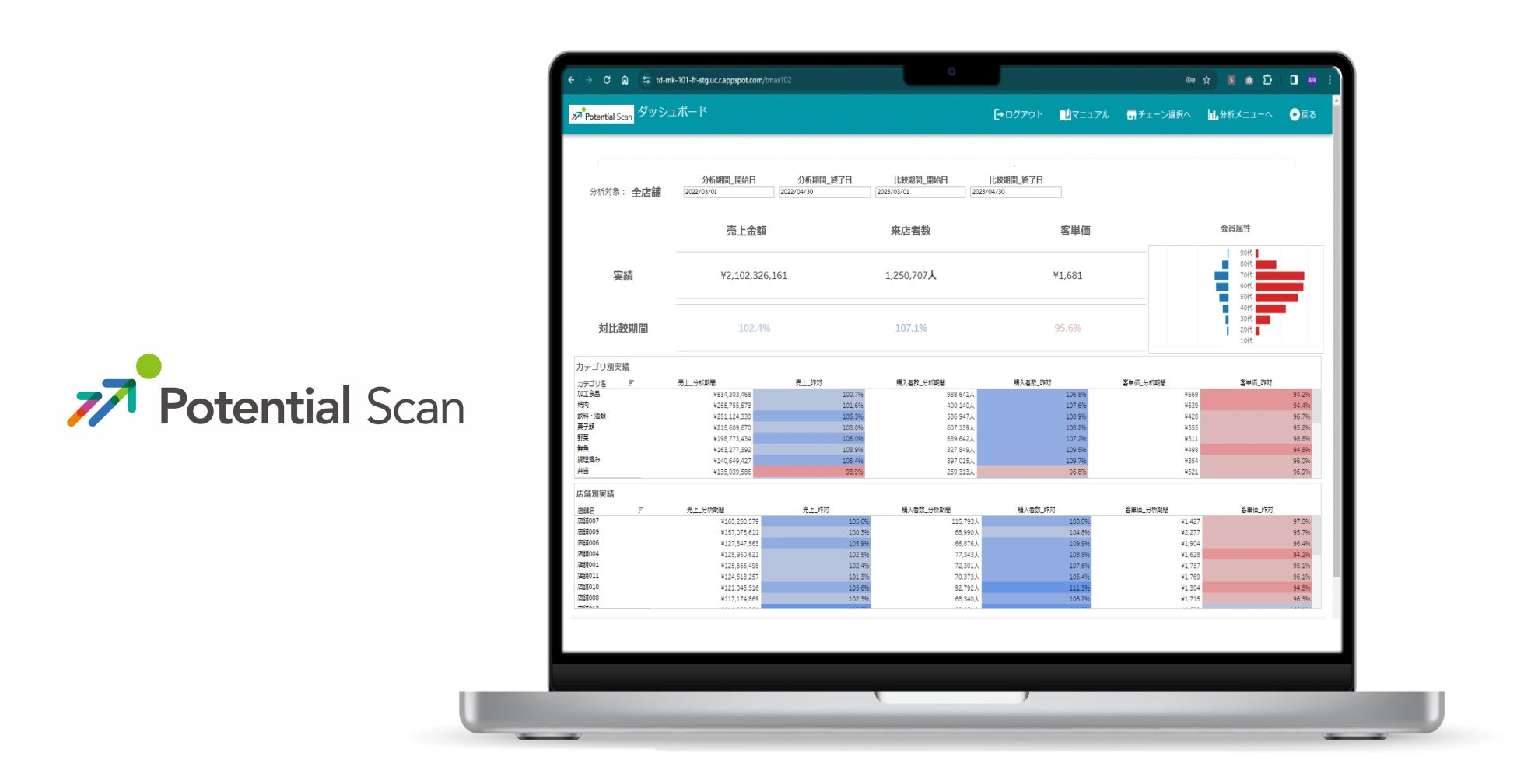 様々な切り口の売上データや来店顧客データをクイックに確認できるダッシュボード機能と、もっと売れそうな商品をさがす商品ポテンシャルAI機能、ふたつの機能をご利用いただけます。