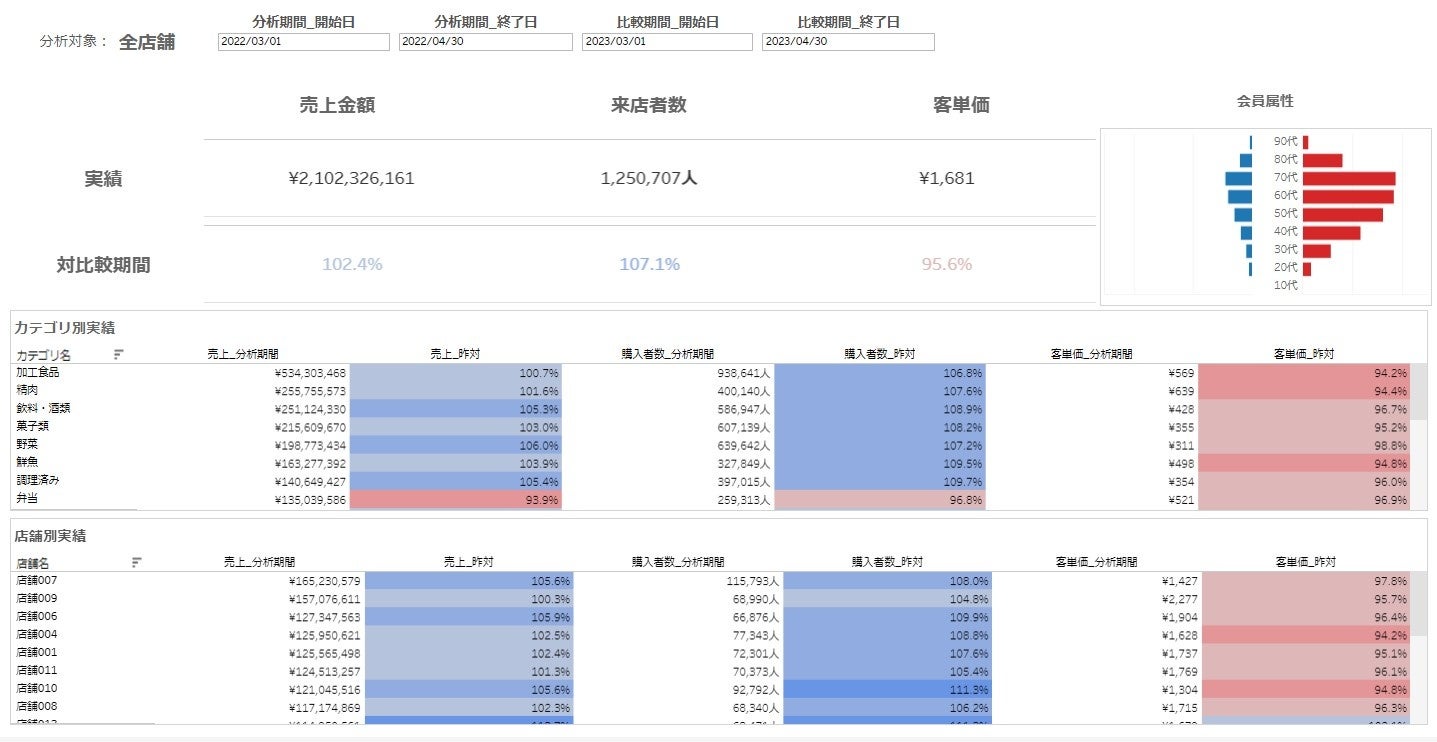 - 期間やカテゴリを選択するだけで、チェーン全体の売上状況から、カテゴリごとに売上の好調・不調要因を深掘りしたり、店舗ごとの売上を比較し、自社の課題をスピーディーに把握